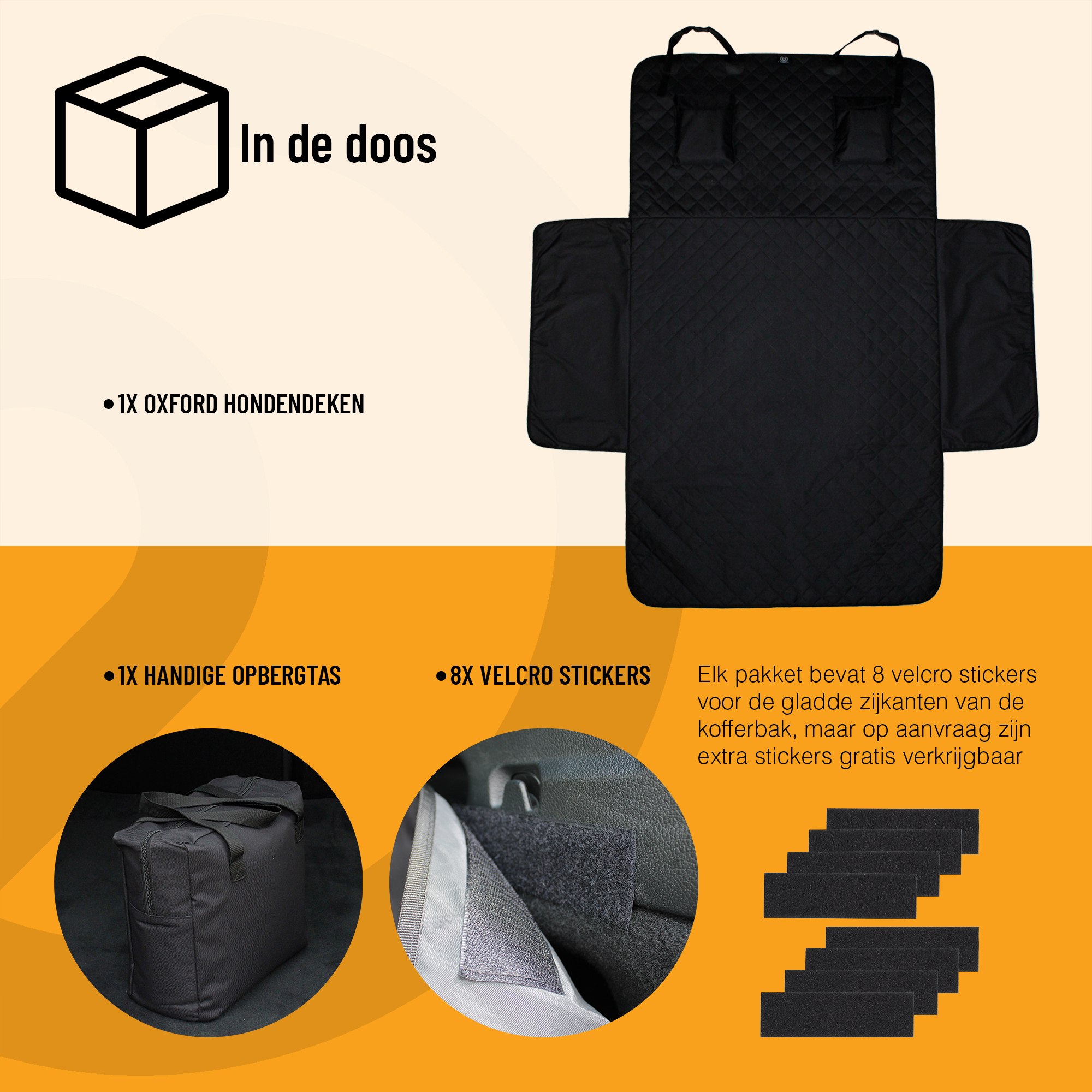 Op zoek naar een premium hondendeken voor de kofferbak van je auto? De Oxford hondendeken biedt bescherming voor je huisdier en je auto. Waterdicht, antislip en comfortabel, deze deken beschermt je kofferbak tegen vuil, haren en vocht na een heerlijke wandeling met je trouwe viervoeter. Universeel ontwerp, eenvoudig te bevestigen en handige opbergvakken maken dit de perfecte keuze voor alle hondenliefhebbers. Ons hondendeken is de perfecte manier om je bagageruimte te beschermen tegen modderpoten, haren en vocht, terwijl jij en je trouwe viervoeter genieten van een comfortabele en veilige rit. Dankzij 2 gespen met kliksysteem bevestig je het deken eenvoudig aan de hoofdsteunen van de achterbak, en haal je het er net zo snel weer af wanneer je de kofferbak anders wilt gebruiken. Schoonmaken is bovendien een fluitje van een cent: je kunt het deken afnemen met een natte doek of spons, afspuiten met een tuinslang, of – voor extra gemak – gewoon in de wasmachine wassen. Zo blijft je auto netjes en fris, zelfs na de meest avontuurlijke wandelingen.