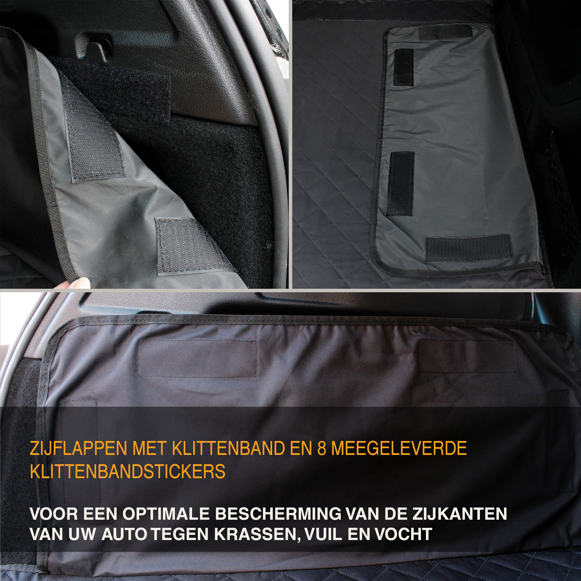 De flexibele zijflappen met klittenband beschermen de zijkanten van je kofferbak optimaal.